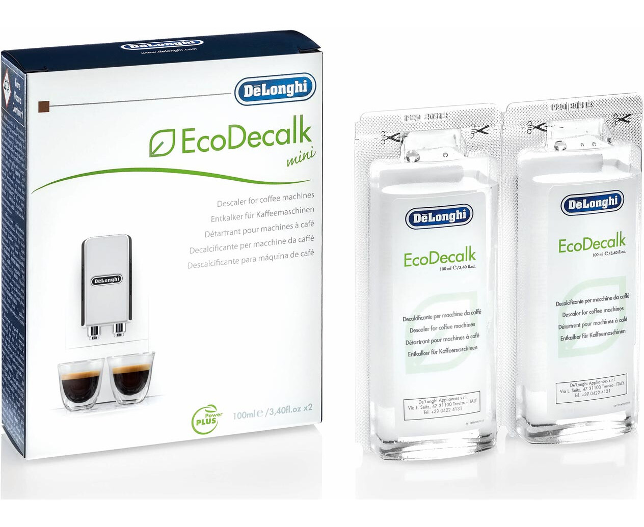 Το υγρό καθαρισμού Eco Decalk της Delonghi περιέχει 2 συσκευασίες των 100 ml. Χρησιμοποιήστε μια συσκευασία κάθε φορά που κάνετε συντήρηση της συσκευής.