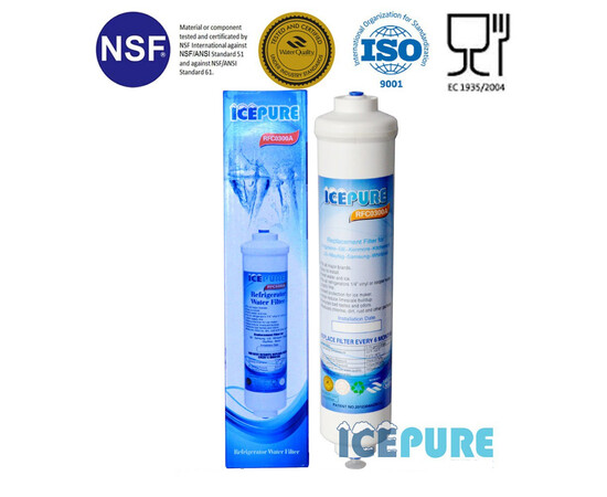 Εξωτερικό (in line) φίλτρο νερού Icepure RFC0300A για ψυγεία με παροχή νερού. Τοποθετείτε στο πίσω μέρος του ψυγείου και αφαιρεί χλώριο, βαριά μέταλλα, τοξικά, μόλυβδο, κάδμιο, βρομιές, φυτοφάρμακα. Πρέπει να κάνετε αντικατάσταση φίλτρου κάθε 6 μήνες. Κατάλληλο για τα ψυγεία WHIRLPOOL SAMSUNG DA29-10105J-EF-9603 –WFS-100 GE GXRTQ;GXRTQR, LG 5231JA2010A;5231JA2010B;5231JA2010C-BL-9808 Daewoo, SIEMENS--EF9603--DD7098 AQUA FRESH---WF283; LIEBHERR---SBS7052-4 HAIER FAGOR ARISTON MIELE NEFF PELGRIM SMEG TEKA