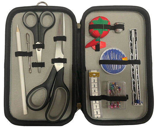 BEGINNER SEWING KIT Περιέχει ψαλιδάκια, μολύβι,πελότα,καρφίτσες ,βελόνες,δαχτυλήθρα,οδηγό μέτρησης σε ίντσες και εκατοστά,περαστήρα κλωστής και τσιμπιδάκι.